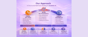 We define AI strategy around measurable enterprise value. We build production-grade, governed AI systems integrated across critical platforms. We embed intelligence into real workflows to improve accuracy, speed, and financial performance. We continuously manage and optimize AI to deliver scalable, long-term impact. We do all this by following a structured 5 step process that delivers measurable value to our customers.